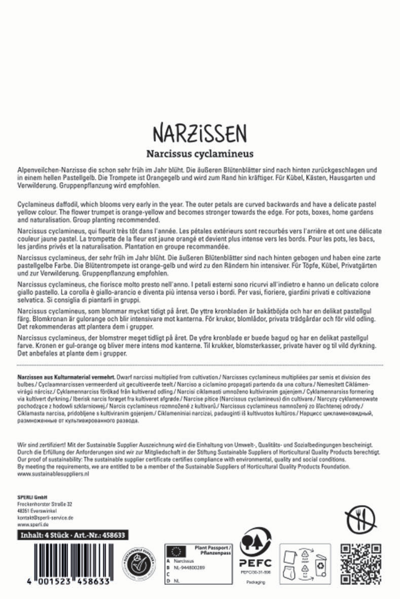 Pflanze Deine SPERLI Alpenveilchen-Narzissen ‘Terry’ im Herbst als Blumenzwiebeln ins Beet, in den Kübel oder in Balkonkästen – gerne auch in Schichten mit anderen Frühblühern. So sicherst Du Dir ein farbenfrohes Blütenmeer im frühen Frühling. Mit den hochwertigen Blumenzwiebeln von SPERLI kaufst Du Blumenzwiebeln, die zuverlässig Jahr für Jahr wiederkommen können.