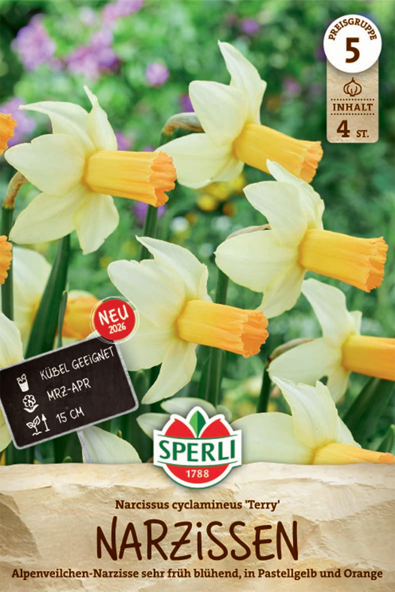 Hol Dir mit der Alpenveilchen-Narzisse ‘Terry’ von SPERLI die ersten warmen Frühlingsfarben in Deinen Garten, auf Deinen Balkon oder auf die Terrasse. Diese besonders früh blühende Narzisse öffnet ihre edlen Blüten schon im März bis April, wenn der Winter gerade erst nachlässt – perfekt, wenn Du Dich nach den ersten Frühlingsblumen sehnst.