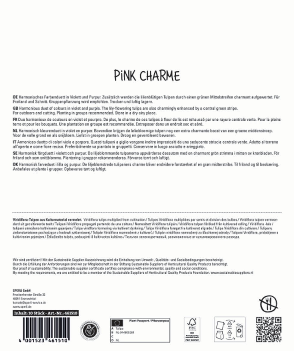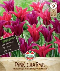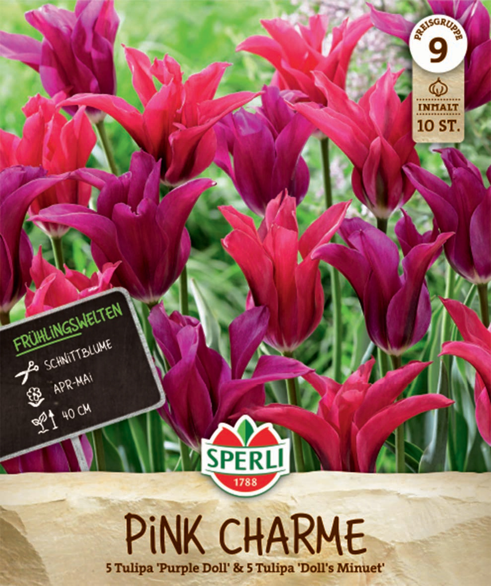 Die Tulpen-Mischung Frühlingsgarten „Pink Charme“ bietet Dir ein harmonisches Farbenduett in Violett und Purpur. Zusätzlich sind die Lilienblütigen Tulpen durch einen grünen Mittelstreifen sehr interessant anzusehen. Die Viridiflora-Tulpen-Mischung besteht aus der Sorte 'Doll's Minuet' in spannendem Rot und aus Der Sorte 'Purple Doll', die ein schönes Lila ziert.