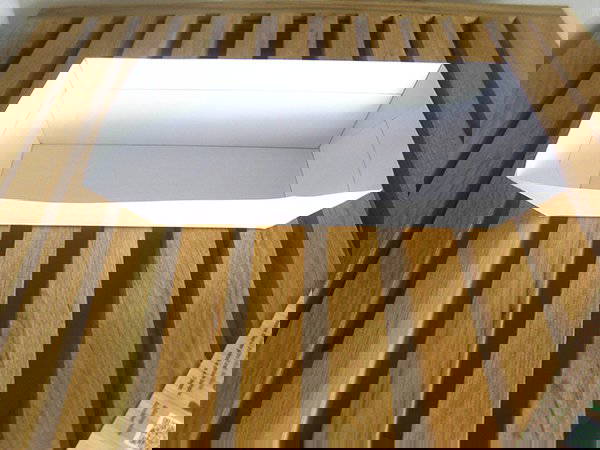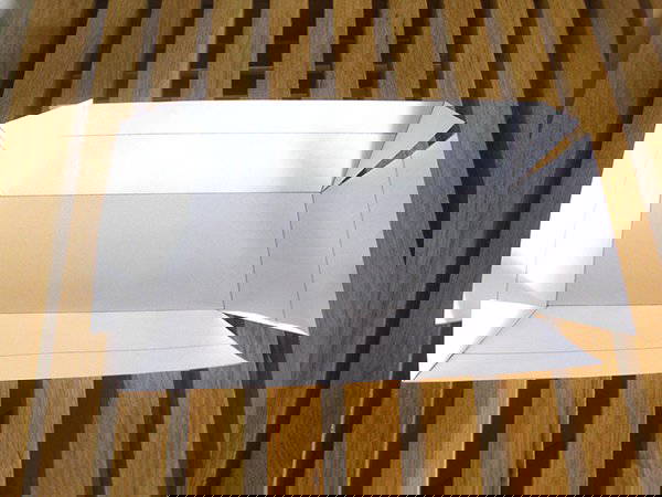 Alle Seiten, entlang der Bodenmarkierung nach innen knicken. Ebenso die kleinen Dreiecke auf einer Seite nach innen knicken.
