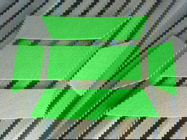 Dazu fertigst Du eine Schablone aus Papier an, wie im 1. Teil beschrieben. Die kleinen Dreiecke rechts und links müssen diesmal entfernt werden. Legt die Papierschablone auf die Filzplatte. Mit schmalem Filzstift umranden und ausschneiden. Ebenso auch die Bodenplatte ausschneiden. Die fünf Einzelteile nun zusammenkleben. Hierbei hat sich eine Heißklebepistole als sehr nützlich erwiesen.